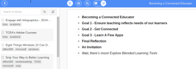 You’ll notice that the items on the left side of the screenimage reflect links that I’ve saved to Diigo, while the right side of the screen shows my outline. The “+” symbol next to each point indicates there is more information. You can see the full outline online–with links–online at http://tinyurl.com/bce2016mg