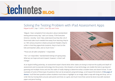 At an Apple briefing yesterday, an assessment expert shared what other states are doing to improve the quality and depth of assessment and incorporate technology into the process. She showed us how technology can enable the tests to go beyond guessing and multiple choice and into the realm of really helping to determine what a student does and doesn’t know. To see examples of some of these type of questions that can be answered using technology, scroll toward the bottom of this page of demos. You’ll find test questions where students must draw or highlight on an image, label a map with drag and drop, sort or order lists by moving items around, plot points and lines on a grid, and much more that cannot be done now with standard paper and pencil testing.
