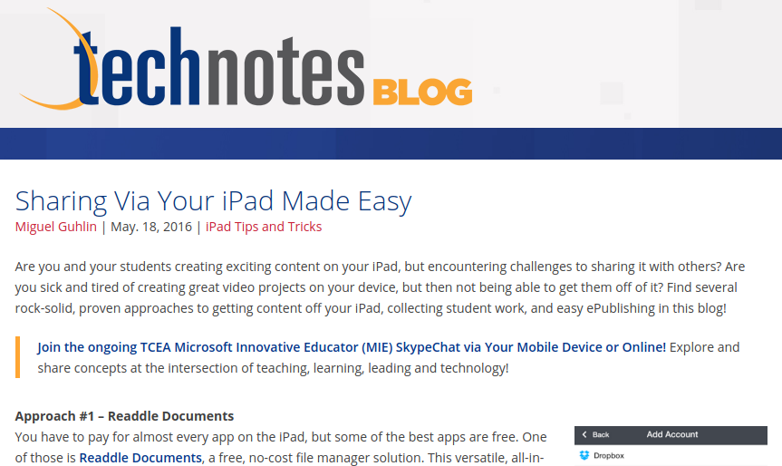 iPads are creation engines for K-12 and adult learners. The problem is “How do you get all those creations off your iPad and some place others can access it?” This blog entry explores free apps and strategies that can make sharing easy. Also featured is GoogleDocs ePub maker. (read more)
