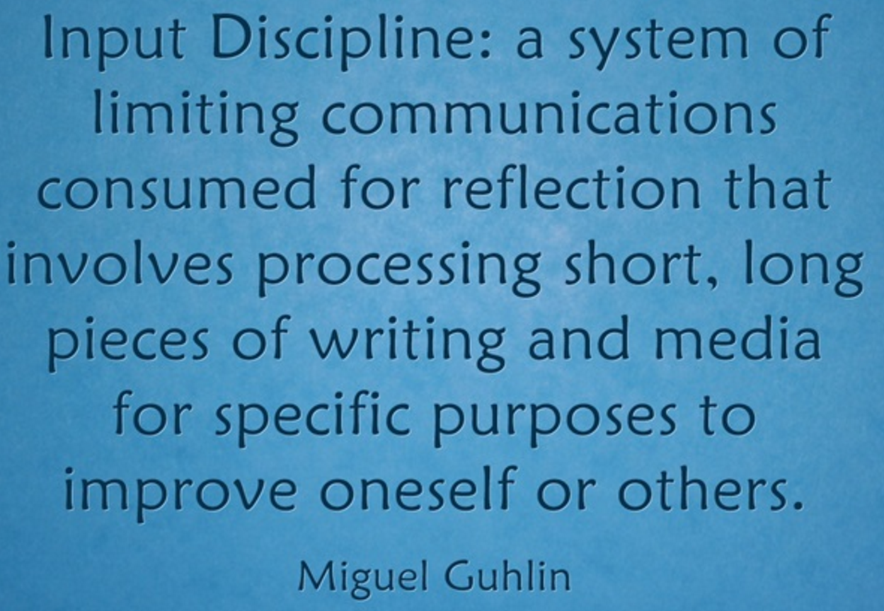 For fun, let’s flip this concept upside down. “Input discipline” might be a way of allowing the least amount of social media input to get the job done. The job? Finding ideas that expand and stimulate intellectual, emotional, and/or spiritual growth as a blogger. Practicing input discipline means that you read some short stuff, some longer pieces of writing to achieve a specific mission objective–working on the self.