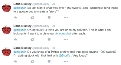 At first, I thought, “Wow, why can’t you do this with IFTTT.com?” But then Dana clarified….this is a chat that took place in the past. I’ve often used IFTTT.com in combination with OneNote, Evernote, or GoogleSheets to capture tweets as they happened (I set it up ahead of a twitter chat).