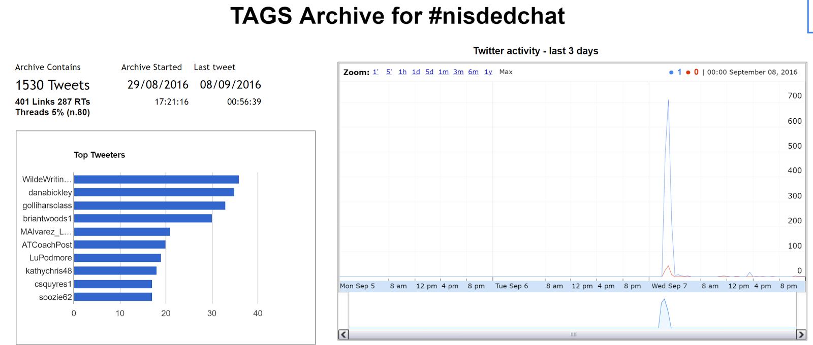 What was interesting was how to capture tweets from a past twitter chat? One approach that I stumbled upon–after running into various services that wanted to charge me for the service –was Twitter Archiving Google Sheets (TAGS), which is completely free and runs as a GoogleSheets add-on. Watch this video tutorial.