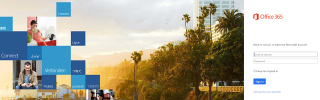 You’ll find the login screen for a work account below…as you can see, where the free account shown above is represented in the center of the screen, the Office 365 account login screen below appears far right of the screen. Pretty simple difference, right? I never noticed it until someone pointed it out to me.