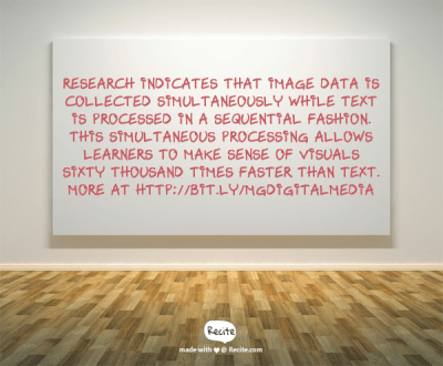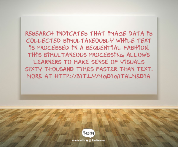 - Research indicates that image data is collected simultaneously while text is processed in a sequential fashion. This simultaneous processing allows learners to make sense of visuals sixty thousand times faster than text.