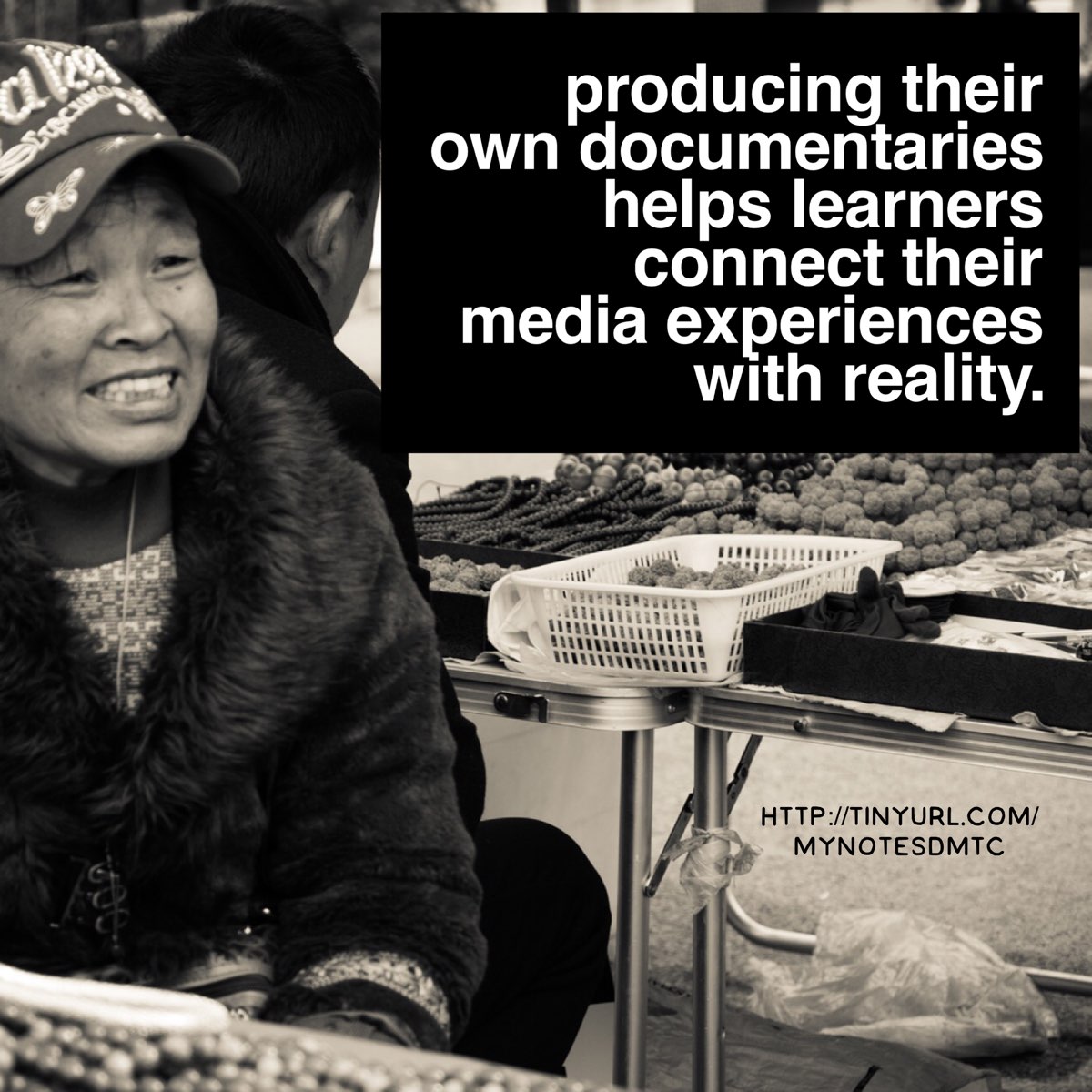 - encouraging students to judiciously document their own experiences with a video camera. The process of producing their own documentaries can serve to encourage learners in re-associating media experiences with reality.
