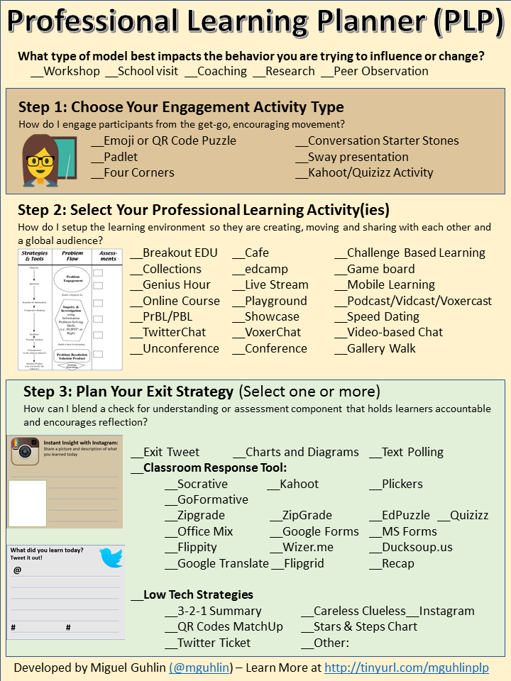 At the end of the chart, you will also find a Professional Learning Planner (PLP) to help you better construct your professional learning experience. Remember that all professional learning must kindle the interest, and occurs with the consent, of the learner. Fail to obtain either, and your professional learning may be doomed.