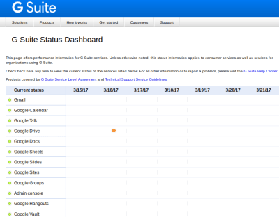 No matter what service you are using, I suspect that somewhere, somehow, there’s a place where you can go check on the status. For example, check out these dashboards (click vendor names to view dashboards) from Microsoft and Google Suites, respectively.