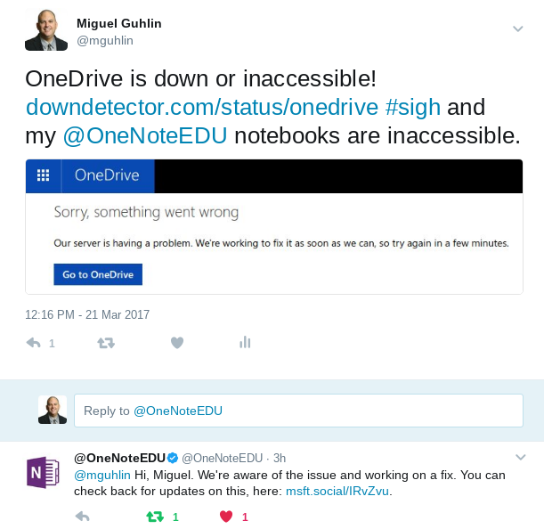 As you can see, OneNoteEDU not only let me know there was a problem, they provided a link to a better source of information! Remember, when there is an outage, it isn’t about yelling and screaming, only an effort to find out what’s going on. You can see I avoided legendary twitter complaint type. My intent and goal was to share my sorrow at being unable to access MONTHS of OneNote notebooks I host on OneDrive…and which aren’t backed up anywhere. A loss of those notebooks would be catastrophic.