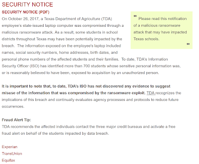 Officials say a Texas Department of Agriculture employee’s computer was attacked through malicious ransomware on Oct. 26, with the attack affecting more than 700 students. Personal information that may have been exposed includes names, Social Security numbers, home addresses, birth dates and personal phone numbers.