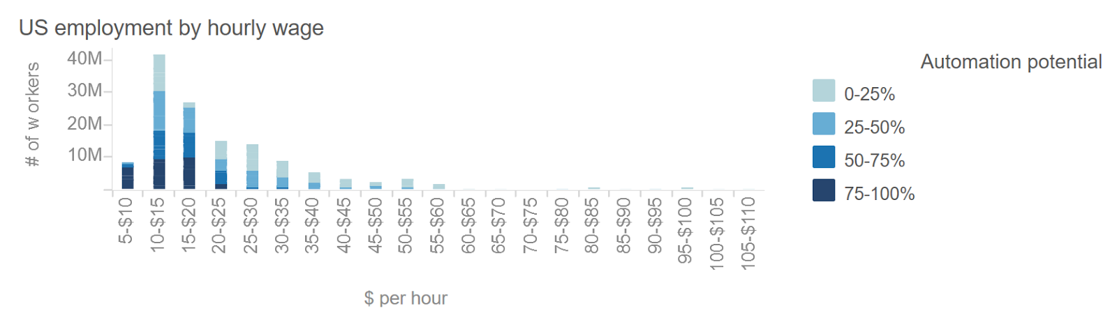 Pretty amazing. Automation is going to hurt the people least able to handle it. Teachers make an average of $27.28 per hour. It looks like about 25-50% teaching jobs are likely to be automated. Am I reading that graph right?