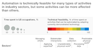 The hardest activities to automate with currently available technologies are those that involve managing and developing people (9 percent automation potential) or that apply expertise to decision making, planning, or creative work (18 percent). These activities, often characterized as knowledge work, can be as varied as coding software, creating menus, or writing promotional materials.