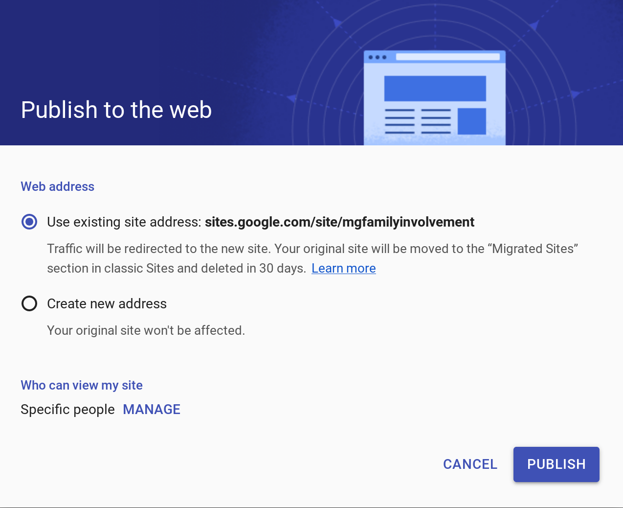 As you can see, I can re-publish the NEW Sites to the old address where the classic version was. Since this is a portfolio item for me, I went ahead and published it.