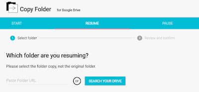 The Copy Folder add-on works well. For HUGE folders, you may run into a Google quota limit. For example, your whole resource will pause and display this in the COPY LOG (sample below): “Paused due to Google quota limits – copy will resume in 1-2 minutes.” You can choose to resume, but this is a manual process (at least, in my experience it has been). It’s not hard, you have to get the URL/web address of the folder you are copying to, then paste it into the appropriate space in the RESUME screen, as shown: