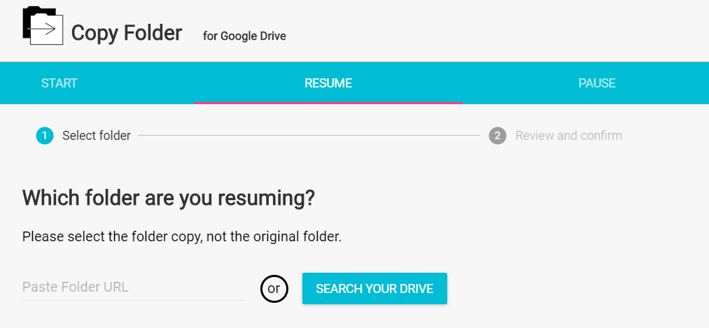 The Copy Folder add-on works well. For HUGE folders, you may run into a Google quota limit. For example, your whole resource will pause and display this in the COPY LOG (sample below): “Paused due to Google quota limits – copy will resume in 1-2 minutes.” You can choose to resume, but this is a manual process (at least, in my experience it has been). It’s not hard, you have to get the URL/web address of the folder you are copying to, then paste it into the appropriate space in the RESUME screen, as shown: