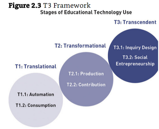 T3: Transcendental Tech Use: In this tier, educators engage students with an ill-structured problem. The use of “ill-structured problem” is code for Problem-Based Learning (PBL). Service learning falls into this as well. Social entrepreneurship that results in generating social good and generating value. 3D printing, coding, design thinking, makerspaces all fall into this level of tech use.