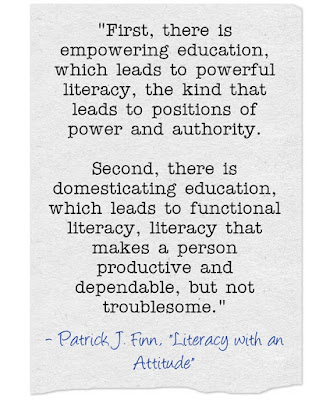Over time, political, social, and economic forces have brought us to a place where the working class gets domesticating education and functional literacy, and the rich get empowering education and powerful literacy.