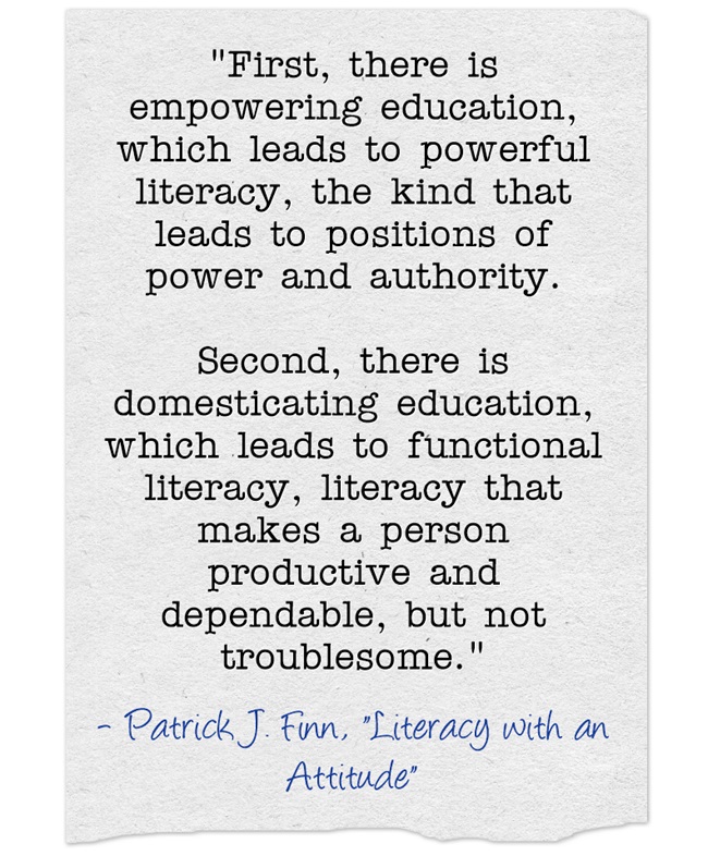 Over time, political, social, and economic forces have brought us to a place where the working class gets domesticating education and functional literacy, and the rich get empowering education and powerful literacy.