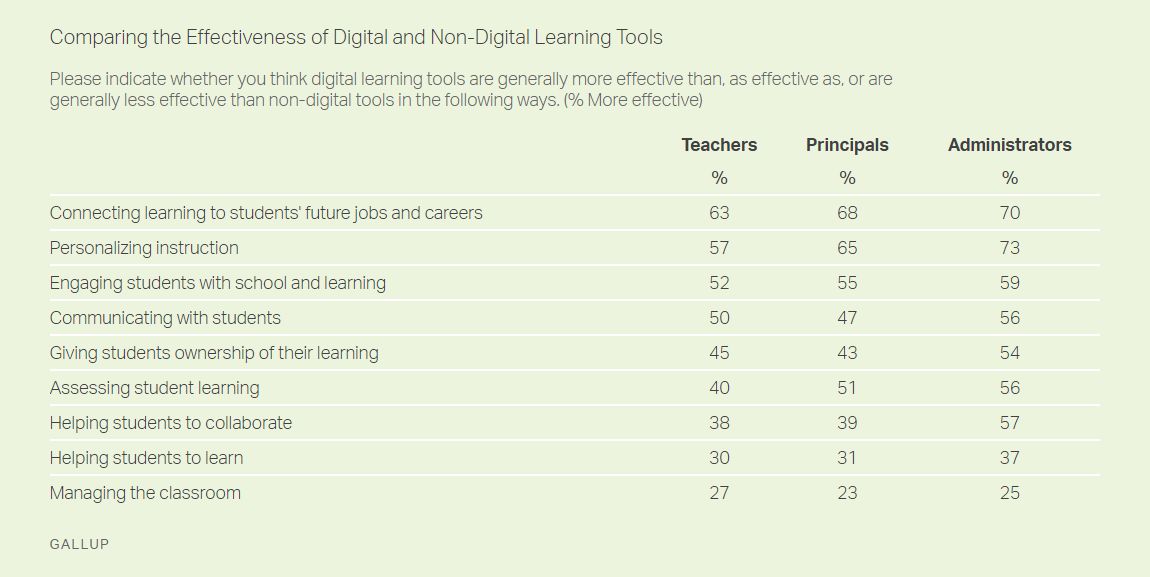 - Digital learning tools are more effective than non-digital learning tools for connecting learning to future jobs and careers, personalizing instruction and engaging students.