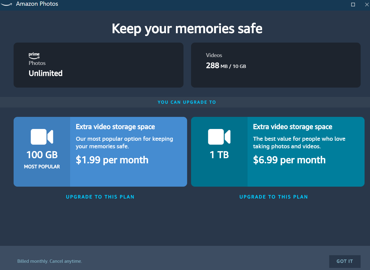 One funny thing that happened, though. I promptly filled up the 10gigs of video storage. While Prime gives me unlimited storage for photos/images, the same is not true of video. You can see the pricing below.