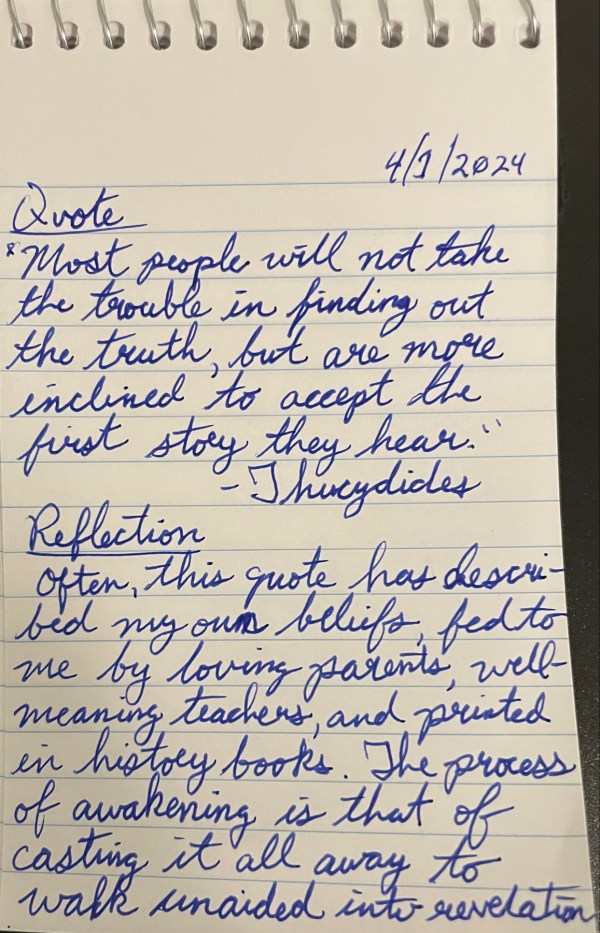 What do you believe without evidence? What truths do you adhere to that, like Thucydides says, are merely the first story you heard, perhaps in your mother’s arms, in the pew, or occupying a pupil’s desk?