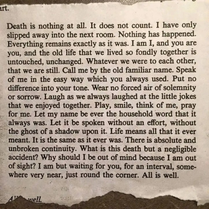April 23, 2024 mguhlin All is Well “All is well” by Henry Scott Holland Discover more from Another Think Coming Subscribe to get the latest posts sent to your email. Type your email… Subscribe Share this: Click to share on Reddit (Opens in new window) Reddit Click to share on LinkedIn (Opens in new window) LinkedIn Click to email a link to a friend (Opens in new window) Email Click to share on Mastodon (Opens in new window) Mastodon Click to share on Bluesky (Opens in new window) Bluesky Click to share on Facebook (Opens in new window) Facebook Click to share on Telegram (Opens in new window) Telegram Click to share on Threads (Opens in new window) Threads Click to share on WhatsApp (Opens in new window) WhatsApp More Click to share on X (Opens in new window) X Like Loading... Related