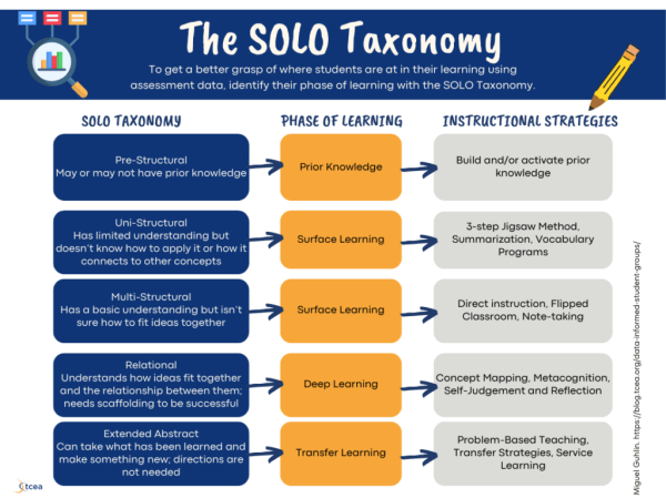 Depending on what phase of learning I’m in (e.g. Pre-Structural, Uni/Multi-Structural, Relational, or Extended Abstract), better described in [**The SOLO Taxonomy chart**](https://blog.tcea.org/data-informed-student-groups/) above, I’m going to need help (e.g. scaffolding) identifying where I’m at, and how to get to desired level.
