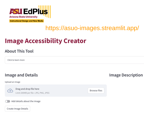 How interesting to discover this resource for Image Accessibility tool from Arizona State University. It appears to be an AI-powered tool to generating alt text, etc.