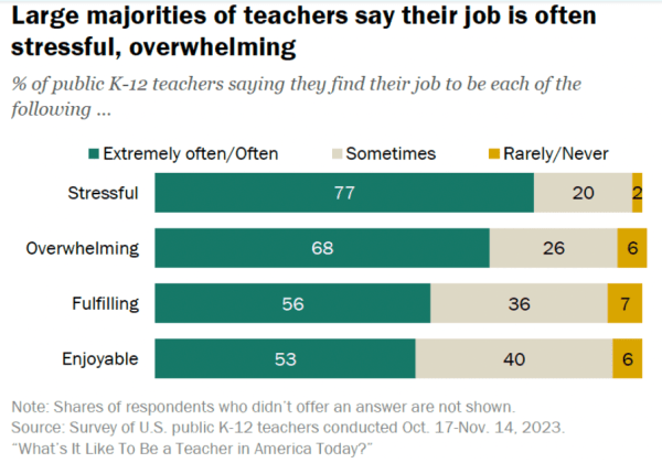 Note: The source for the image above is from a survey of U.S. public K-12 teachers conducted between October 17 and November 14, 2023, titled “What’s It Like To Be a Teacher in America Today?”