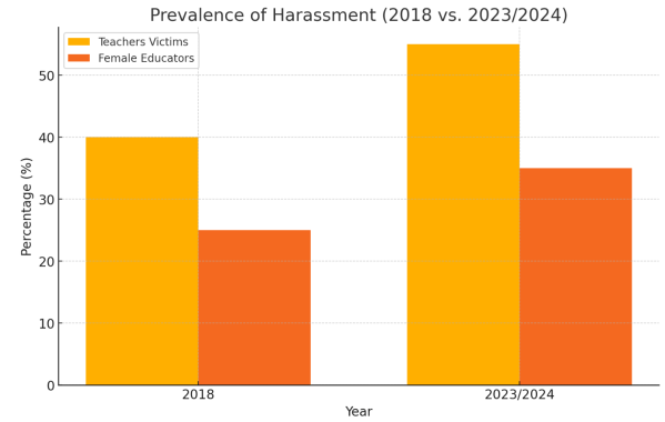 > Yes, based on the data presented, there has been an increase in harassment against female teachers from 2018 to 2023/2024.