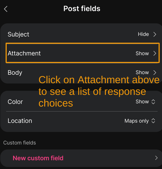 Click the gear on the right side of the screen, and access the Settings, including the Engagement settings. Then, click on **POST FIELDS**. You are going to click on that then modify **ATTACHMENTS**.