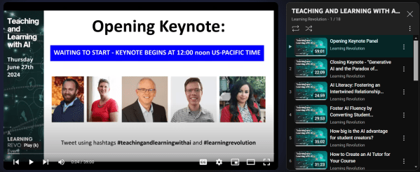 The Teaching and Learning with AI Summit took place last week, and I thought I’d share the link to all the videos via YouTube. I am working my way through the videos.