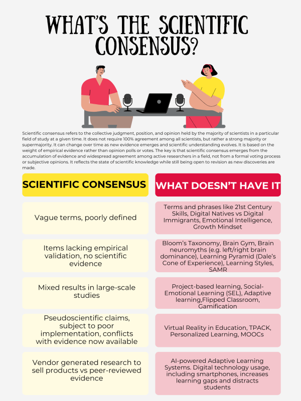 This table includes educational ideas and approaches that have gained popularity but lack strong scientific consensus. It’s important to note that some of these ideas, while not strongly supported by current evidence, may still offer valuable insights or practical applications in certain contexts. However, educators and policymakers should approach them critically and consider the available evidence when making decisions about implementation.