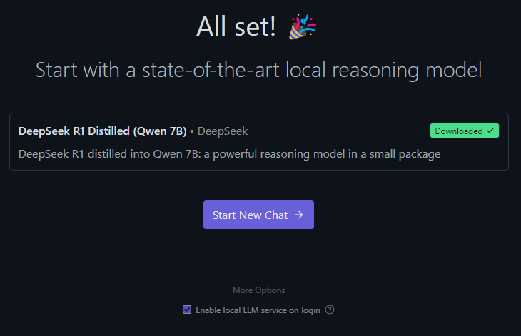 Installation was pretty easy. Double-click the executable file on Windows and installation happens thereafter. As soon as you run it, you’ll be asked to install an LLM: