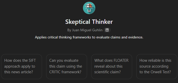 You may find this MGpt I made for Skeptical Thinking of interest. The Skeptical Thinker MGpt is an effort to combine a variety of skeptical thinking models into one space. Previously, I set up different GPTs for the following: