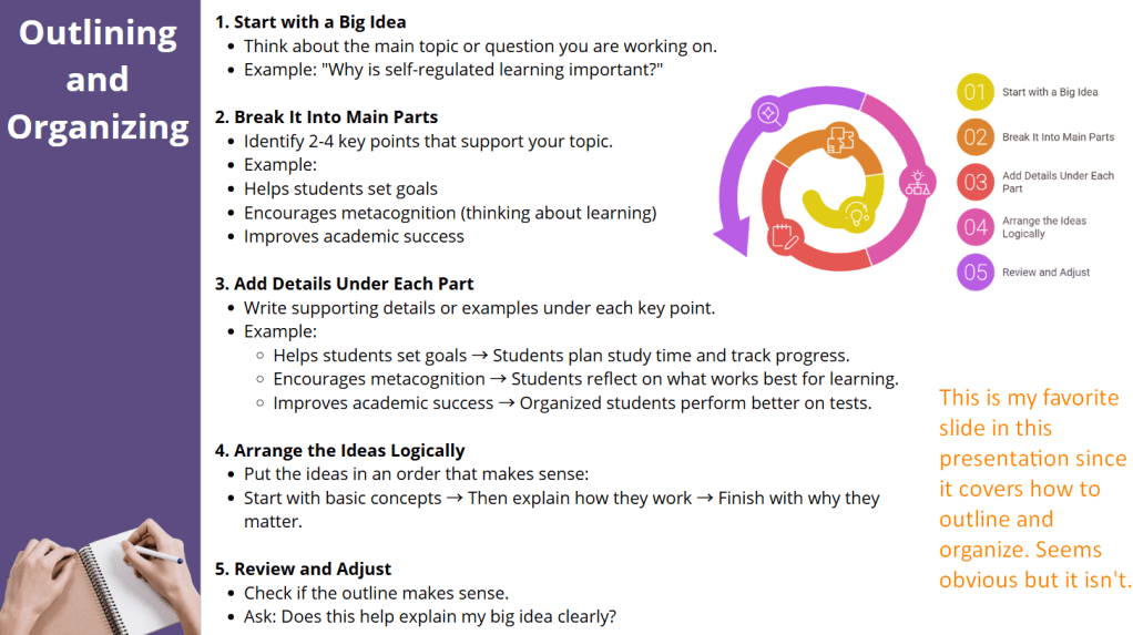 If you are wondering why I’m covering Outlining and Organizing, you may be surprised to learn that the Summarization strategy dropped in effect size from .74 to .45, while Outlining and Organizing jumped up to .84…and the description is focused on finding main ideas, identifying supporting details, dumping the unnecessary (summarizing by another name would smell as sweet) AND organizing. It’s the organizing that has the impact, I suspect.