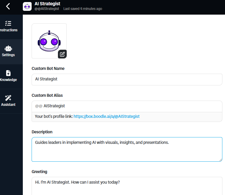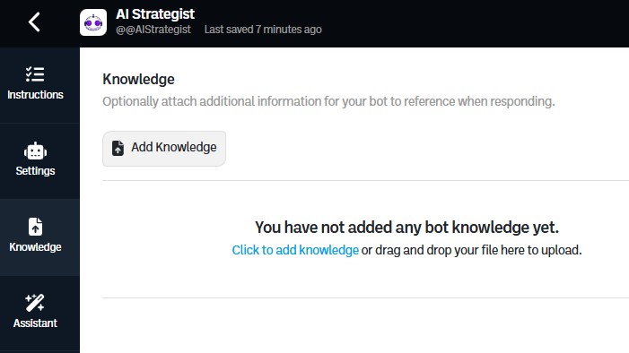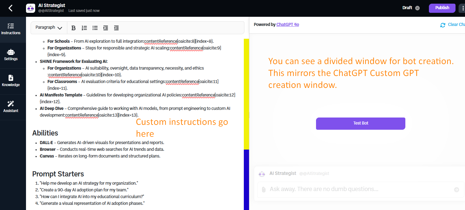 In the screenshot below, you can see what Bot creation looks like. On the left side of the screen, you see several menu items (Instructions, Settings, Knowledge, Assistant), the screen showing an easy to edit custom instructions window, and a place to test the bot.