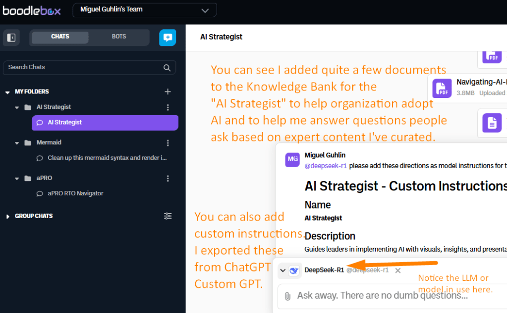 In the screenshot above of the AI Strategist, I’m using a whole bunch of PDF, text, and image files. However, a chat with a Knowledge Bank is NOT a Custom GPT…it’s more of like a ChatGPT Project, Claude Project, or Perplexity Space.