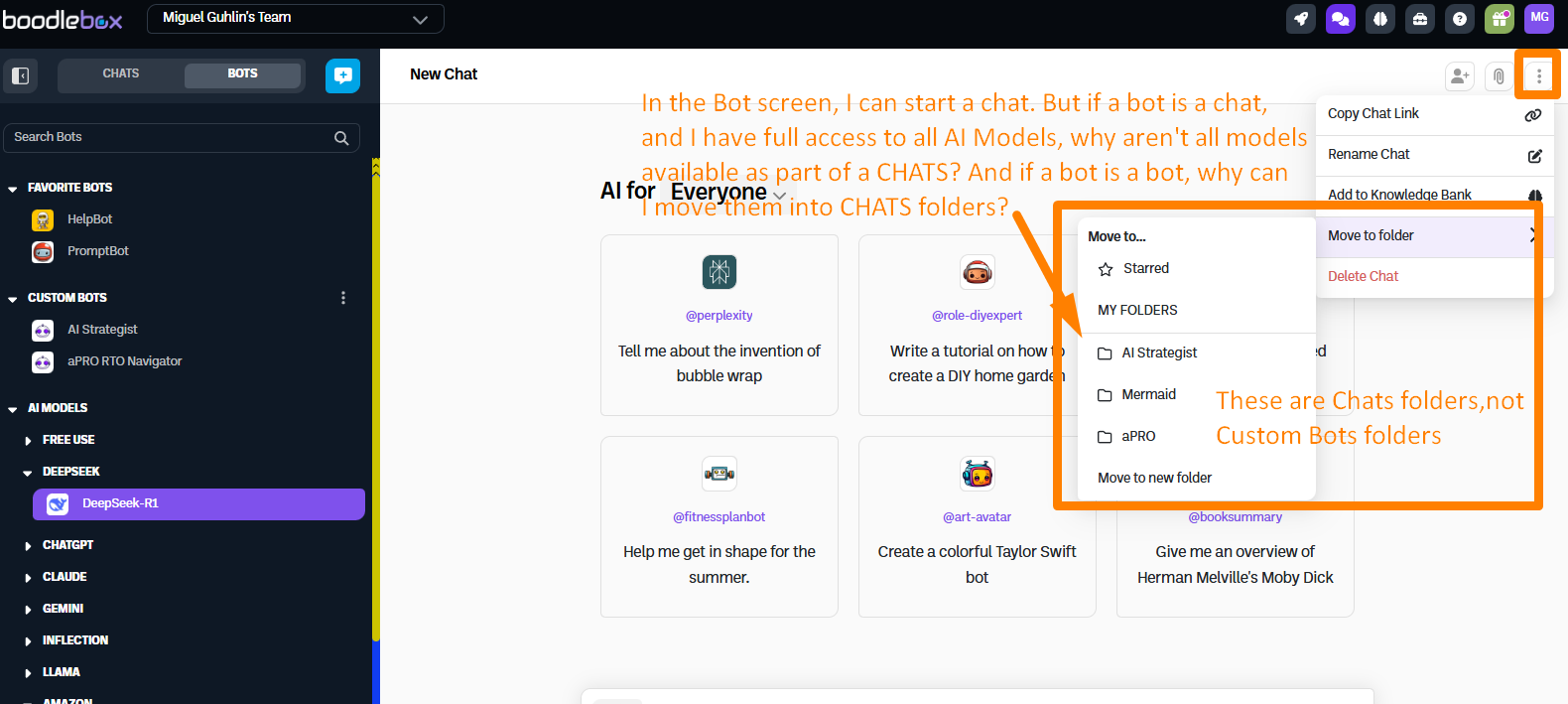 - When creating a chat inside an existing folder (e.g. AI Strategist), I’m stuck with a limited list of models to use. But Bots have full access to a wide variety of models. What’s up with that?