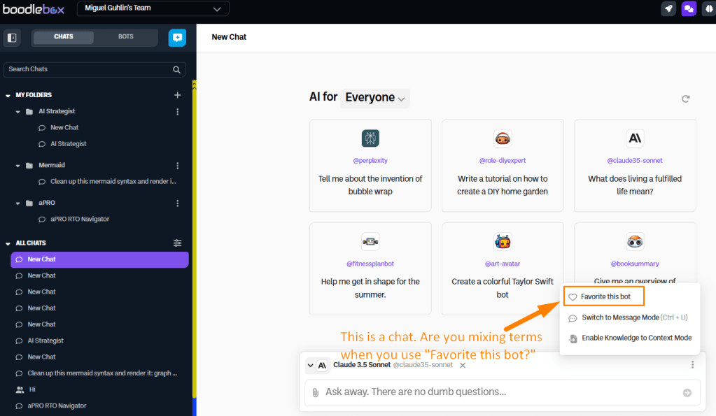- In the screenshot below, there is an option to “Favorite this bot.” But I’m in a chat. It’s a little confusing…why not say, “Favorite this chat?”