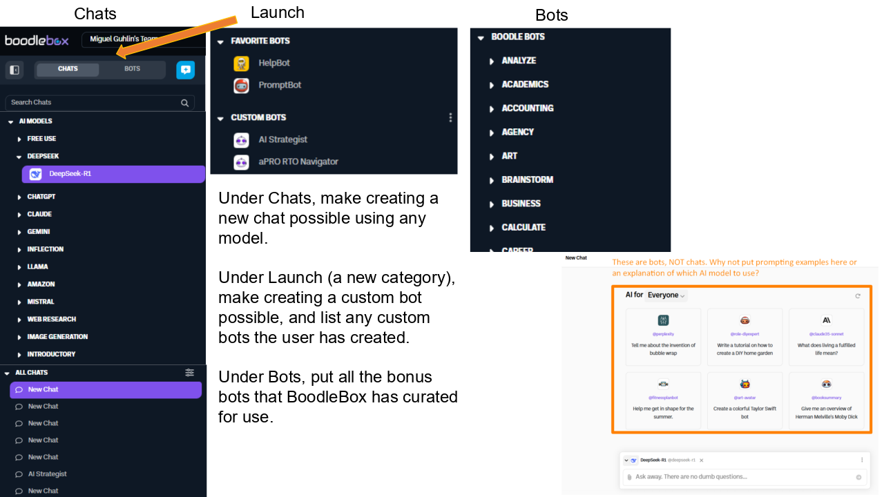 | – Allows users to switch between AI models and bots. – Offers vocabulary-building features. – Businesses can train and sell custom bots. – Schools and higher education have limited applications due to compliance and privacy concerns. – Pricing: $20 per person, site licenses available, free 3-month trial with referrals. – Set up bots using a variety of LLMs (e.g. DeepSeek, Claude, ChatGPT, Perplexity, etc.) and each can have its own Knowledge Bank. – Create chats that anyone can access with a free Boodle Box account. | – Helps users access different AI models for various needs. – Provides a structured way to interact with AI in collaborative settings. – Offers monetization options for businesses. – Challenges in education due to privacy, compliance, and limited adaptability. – Encourages AI literacy and knowledge-sharing in professional settings. |