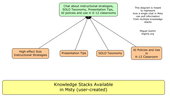 I like the idea of a “digital backpack” that holds relevant documents. I imagine knowledge stacks as backpacks hanging from digital pegs in my garage, ready for use. What Msty makes it easy to do is to add multiple knowledge stacks to a single chat.