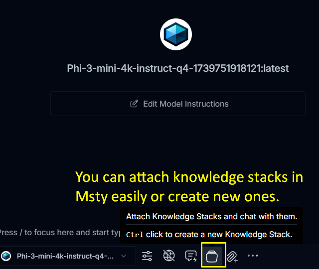 As I mentioned before, I’m using Msty after trying out several solutions for hosting an AI locally on my computer. Now that I’ve found an AI model that runs fast on my machine (Phi-3-mini-4k-instruct-q4-1739751918121:latest via HuggingFace), I’m ready to start creating Knowledge Stacks in earnest. A little about the model: