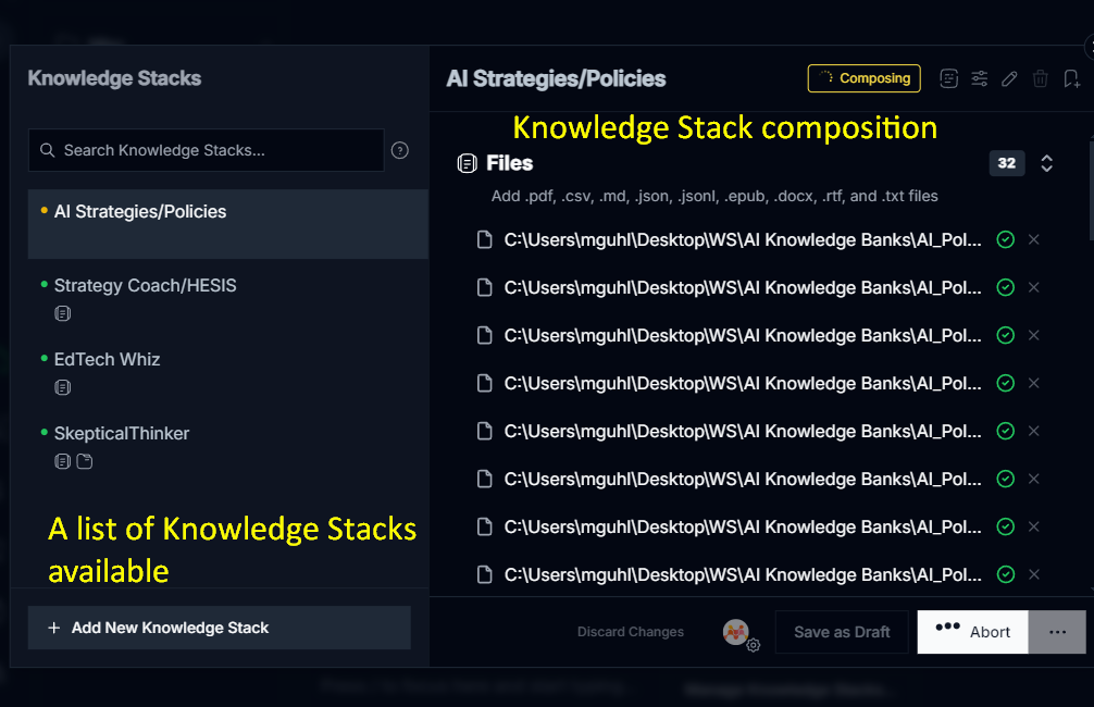 A knowledge stack for me is a specific collection of documents that you want the AI chatbot to have access to. I see it as a way of plugging in relevant data and information into the AI’s “brain.” In a lot of ways, it reminds me of the “outboard” or second brain analogies people use when talking about their searchable blogs. The knowledge stack augments what the AI already knows. In the case of local AI, it’s important to have a knowledge stack. The reason why I think so (which may be wrong) is that a local AI may have limited access to information because of its training and/or internet access (usually off). The knowledge stack provides much needed information that is may not have in its own general knowledge.