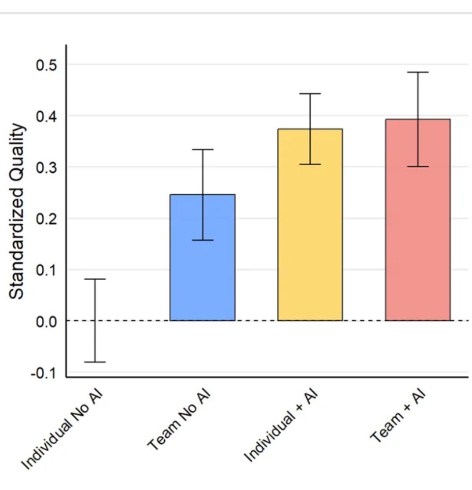 - Teams outperformed individuals by 0.24 standard deviations without AI.
