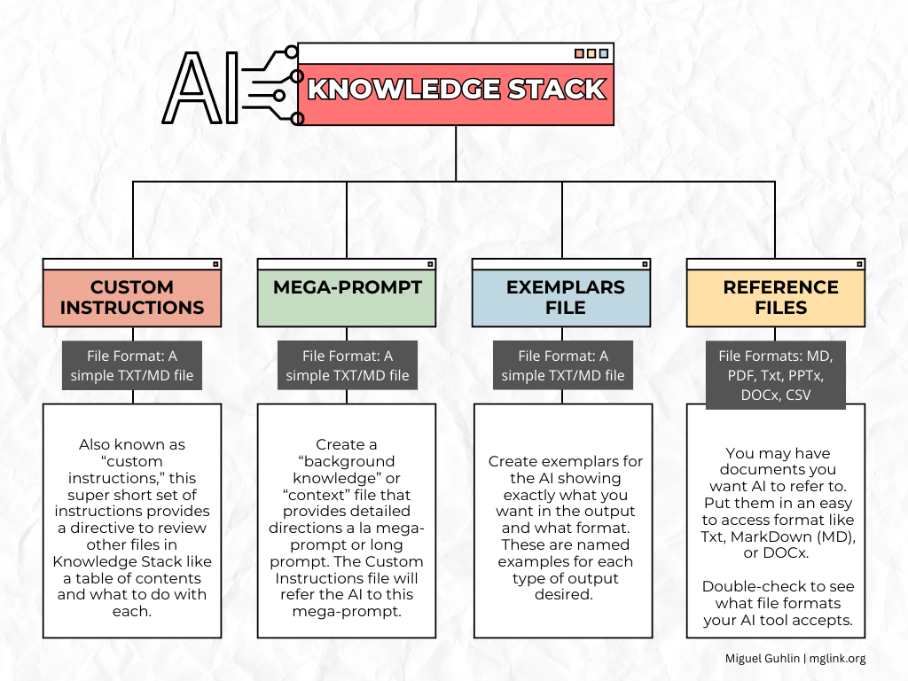 Chatting via Mastodon with Moe, I got the idea to refine my awareness of AI Knowledge Stacks a little more. The question going around in my head is, “How can I really boil this down to make it easy for future knowledge stacks I create? How can I organize a folder on my computer where I have a “grab-n-go” set of resources for an idea. This is informed by some ideas resulting from my experiences.