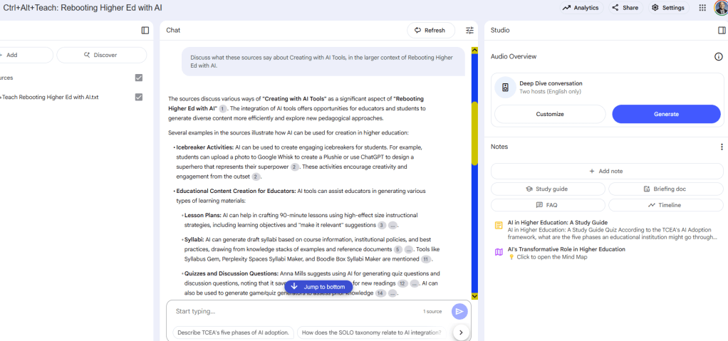 I’m not spending a lot of time on Notebook LM. Others are going to cover this tool at future events, but I got the idea from a Facebook chat about using Notebook LM to create study guides, quizzes, etc. with it. Let’s take a look.