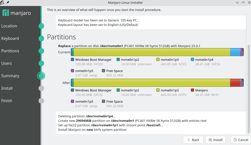 I love how Manjaro gave me so much information in the screen above what it was going to do, and that it knew to not mess with my Windows install (I’m hoping it is still there). As I’ve been typing this, the installer has finished up and is ready to restart.