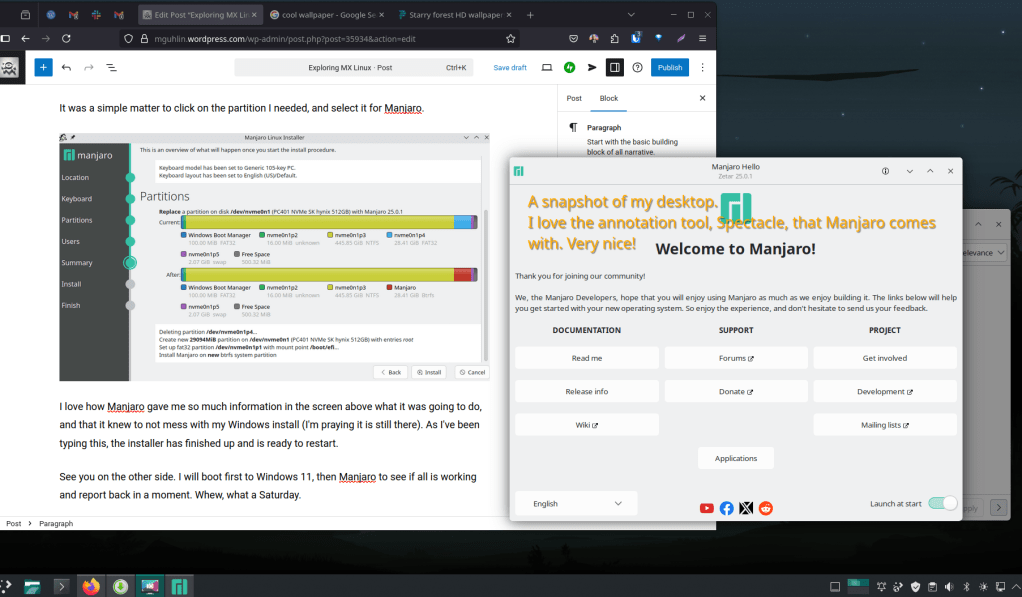 One of the things that Manjaro did that MX Linux didn’t do? Recognize my second monitor via HDMI. It also had a super polished look. This was not the Manjaro I remembered from 10 years ago.