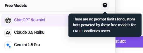 For free BoodleBox users, this means realistically, you can only create Bots that are based on the free models because otherwise they will only get five uses. I wish they allowed 20 uses…that would work in a workshop. And, of course, the users must have a Boodle Box account…I wish if we used the free models, users wouldn’t need an account. Sigh. I have a similar complaint about ChatGPT.