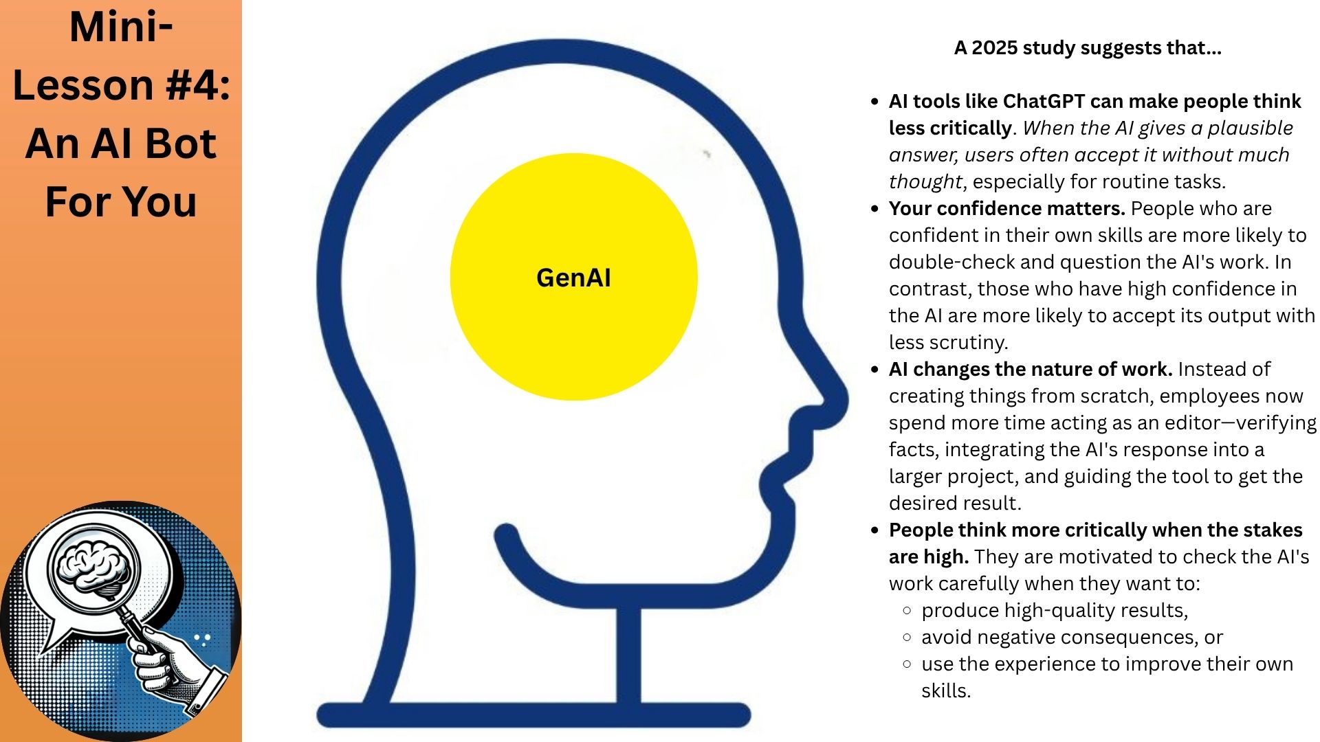 - AI tools like ChatGPT can make people think less critically. When the AI gives a plausible answer, users often accept it without much thought, especially for routine tasks.